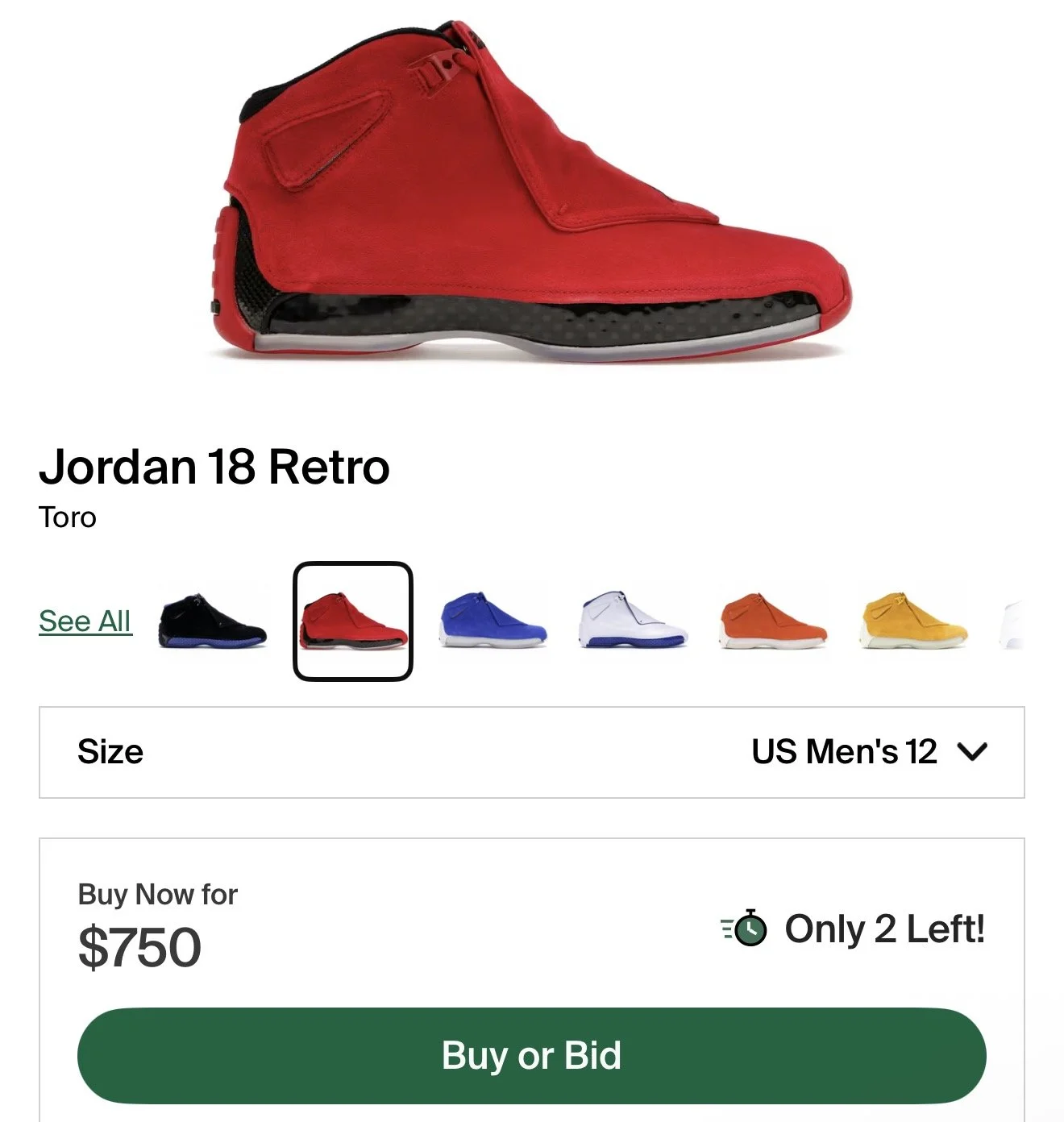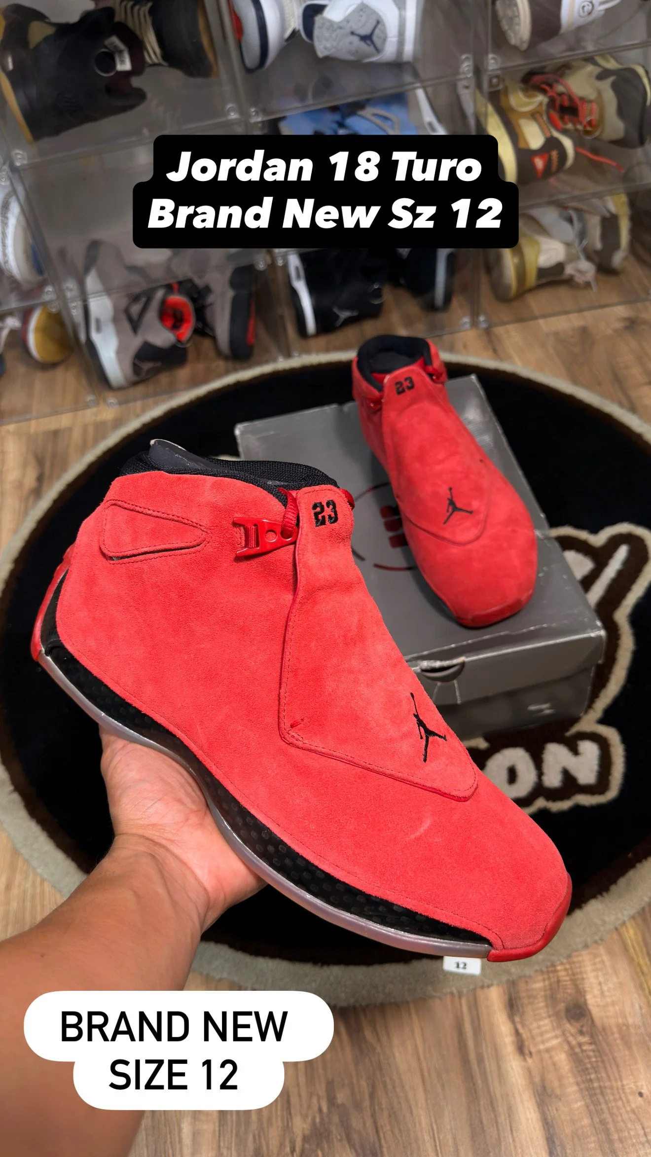 Air Jordan › Jordan 18 Retro Turo Size 12 Image 1 of 2 Image 2 of 2 Jordan 18 Retro Turo Size 12 $350.00 Brand newSize 12 box a little damaged A little aging but shoe is still fine and wearable Og all Get notified by email when this product is in stock. Purchase Added! Brand newSize 12 box a little damaged A little aging but shoe is still fine and wearable Og all Reviews Reviewer Name Review Date Star Rating Description Posted on Etsy Product Show More
